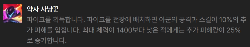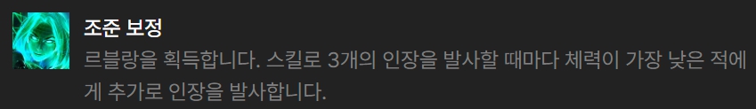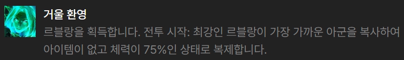 영웅 증강체로는 조준 보정(르블랑), 거울 환영(르블랑), 약자 사냥꾼(파이크)가 좋습니다.