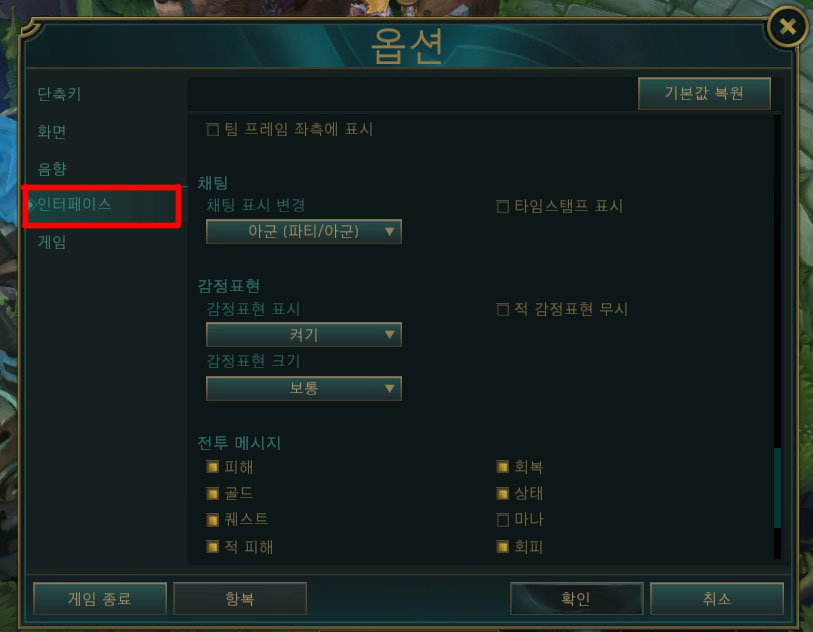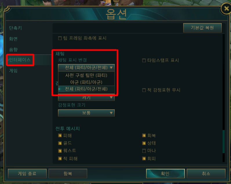채팅의 '채팅 표시 변경' 부분에서 '전체 (파티/아군/전체)'로 설정을 해주신 뒤 확인을 눌러줍니다.