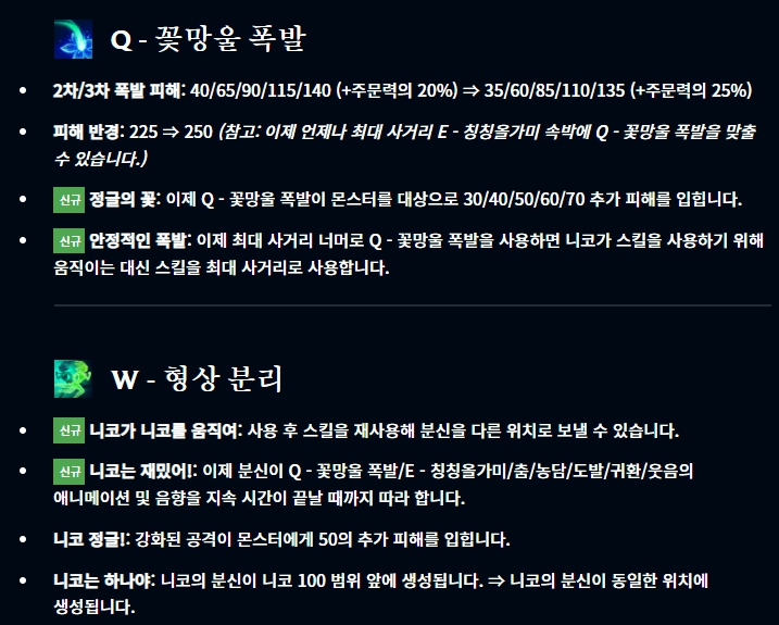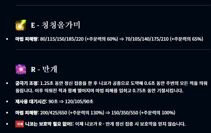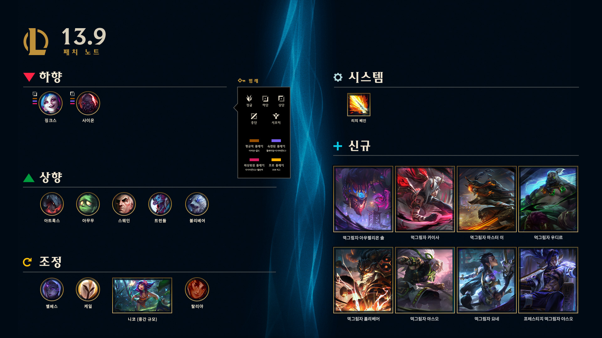 이번 시간에 알아볼 것은 롤 13.9 패치노트의 내용입니다. 과연 어떤 챔피언들이 어떻게 변경되었는지, 그리고 아이템이나 룬, 기타 변경점은 무엇이 있는지 하나하나 확인해보도록 하겠습니다. 이번 패치의 가장 큰 핵심은 니코의 변화인 것 같네요. 바로 살펴보겠습니다.