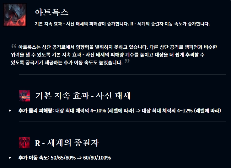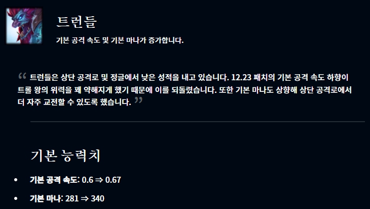 아트록스, 아무무, 스웨인, 트런들, 볼리베어가 버프되었습니다.