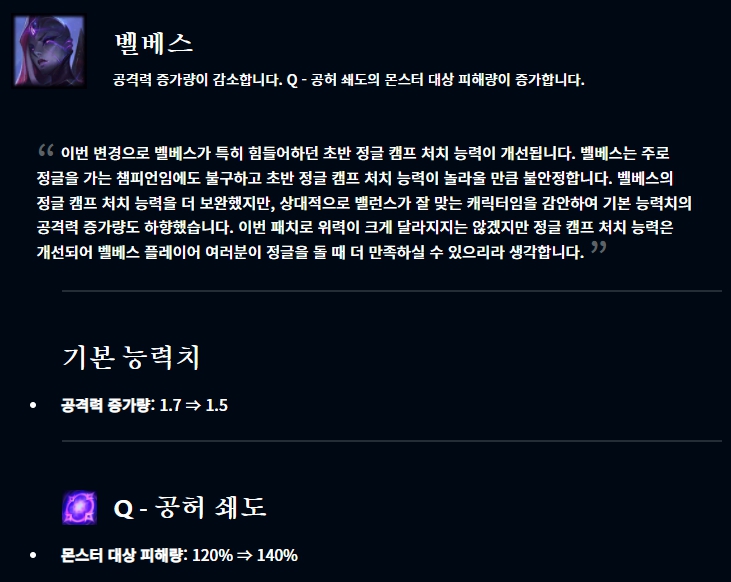 이번 패치에서 하이라이트를 살펴보면 아트록스, 아무무, 스웨인, 트런들, 볼리베어는 상향, 징크스와 사이온은 너프, 벨베스, 케일, 탈리야, 니코는 조정되었습니다. 또한 아이템 부분에서는 리치 베인이 변경되었습니다.