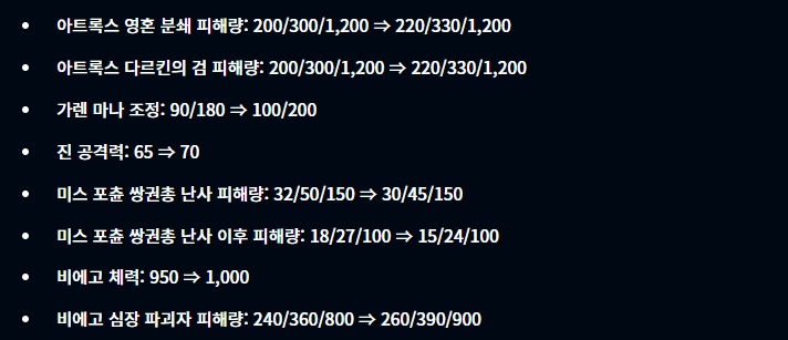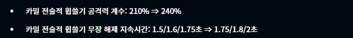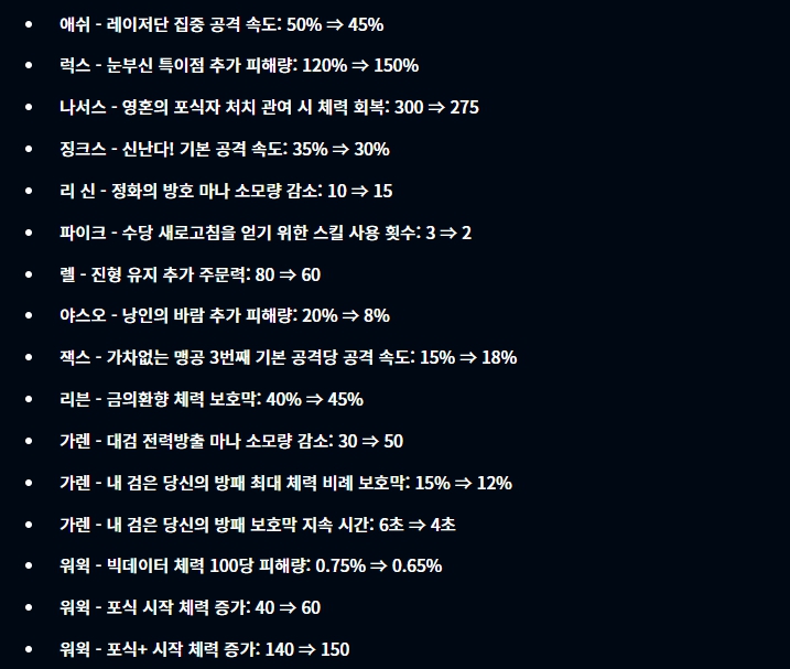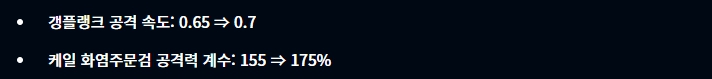 챔피언 부분은 그렇게 많은 변화는 없네요. 그나마 눈여겨볼 것은 카밀이 크게 상향된 점입니다. 카밀덱이 아마 떠오르지 않을까란 생각이 듭니다.