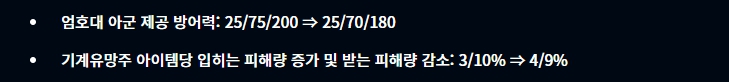 엄호대의 아군 제공 방어력이 감소하였고, 기계유망주 아이템당 입히는 피해량 증가 및 받는 피해량 감소가 낮은 구간에서 증가, 높은 구간에서 감소되었습니다.