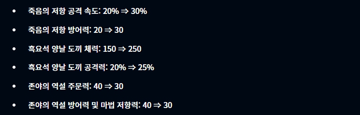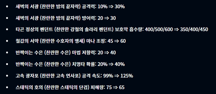 아이템 부분에서는 오른 아이템, 찬란한 아이템류가 버프 혹은 너프되었습니다.