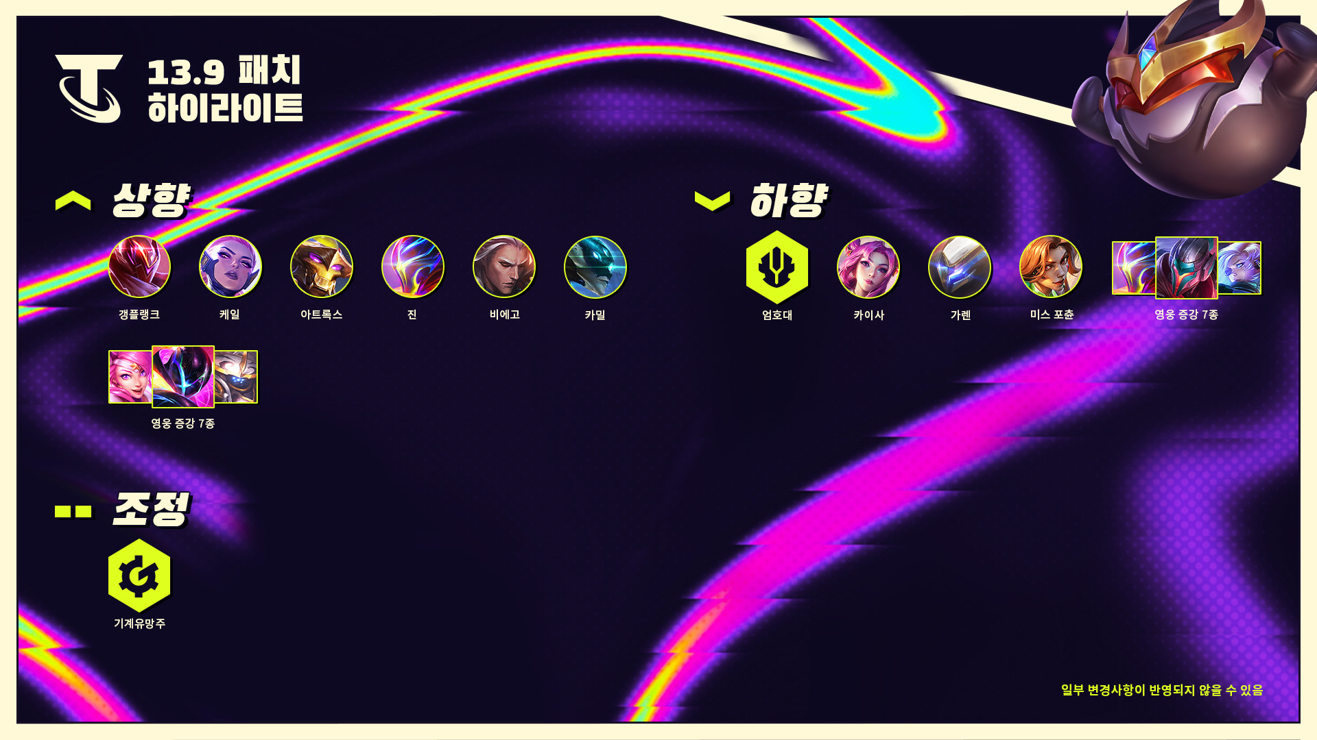 하이라이트를 살펴보면 챔피언 부분에서는 갱플랭크, 케일, 아트록스, 진, 비에고, 카밀이 상향되었고, 카이사, 가렌, 미스 포츈이 너프되었습니다. 그 외에 특성 부분에서는 엄호대가 하향, 기계유망주가 조정되었습니다.
