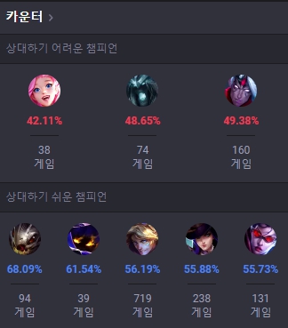 원딜 직스의 카운터 챔피언은 세라핀, 카서스, 바루스로 집계되었으며, 상대하기 쉬운 챔피언은 코그모, 베이가, 이즈리얼, 케이틀린, 베인으로 집계되었습니다.