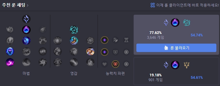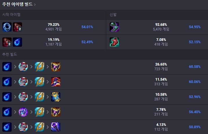 처음 시작 아이템은 도란의 반지와 포션 두 개로 시작하여 첫 귀환에서 여신의 눈물을 뽑아주고, 이후 리안드리의 고뇌를 첫 코어 아이템으로 올려줍니다. 리안드리를 올린 뒤 신발은 마법사의 신발, 이후에는 대천사의 지팡이까지 고정으로 띄워줍니다. 이후에는 그림자불꽃, 라바돈의 죽음 모자, 존야의 모래시계, 공허의 지팡이 등을 상황에 맞게 유동적 템트리를 올려줍니다.