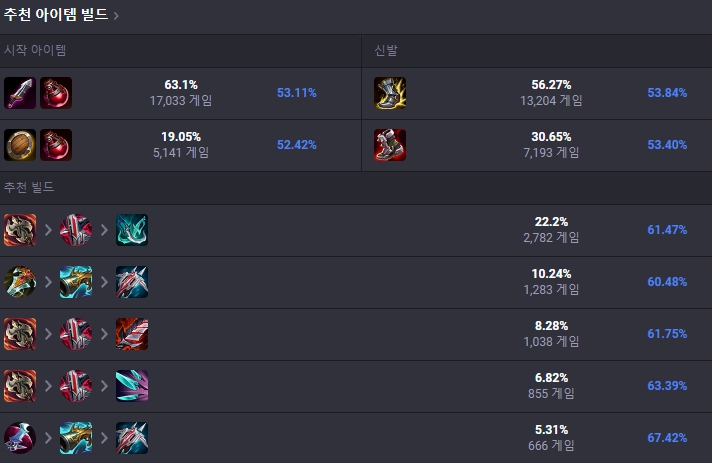 처음 시작 아이템은 도란의 검과 포션 하나로 시작하여 첫 코어 아이템으로는 굶주린 히드라를 올려줍니다. 굶주린 히드라를 올린 뒤 신발은 광전사의 군화를 올려주고, 이후에는 불멸의 철갑궁까지 고정으로 띄워줍니다. 이후에는 유령 무희, 도미닉 경의 인사, 피바라기, 나보리 신속검 등을 상황에 맞게 유동적으로 올려줍니다.