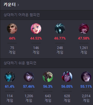 닐라의 카운터 챔피언은 스웨인, 세라핀, 카서스, 자야로 집계되었으며, 상대하기 쉬운 챔피언은 칼리스타, 아펠리오스, 트위치, 바루스, 카이사로 집계되었습니다.