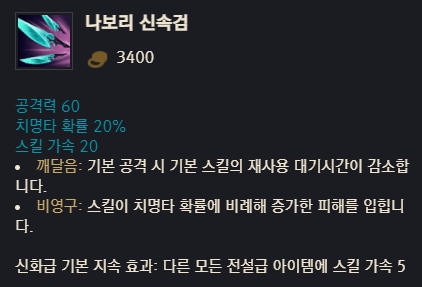 갱플랭크, 루시안, 자야, 이즈리얼, 카이사, 트린다미어 등 스킬 딜링이 주력이면서 스킬 가속도 중요한 치명타 기반 챔피언이 주로 나보리 신속검을 올립니다.
