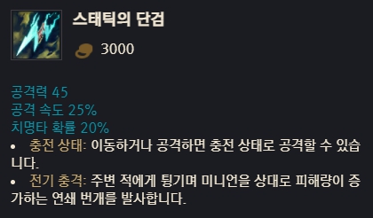 이번 시간에 알아볼 것은 스태틱의 단검입니다. 롤 13.10 패치 이후 아이템 일러스트도 바뀌고 효과도 변경되었는데, 과연 어떻게 바뀌었을까요? 지금 알아보도록 하겠습니다.