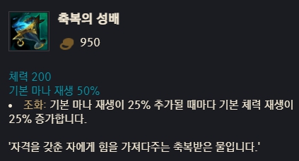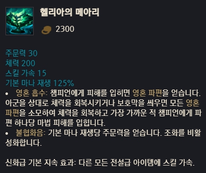 신화급 아이템으로 기본 옵션은 주문력 30, 체력 200, 스킬 가속 15, 기본 마나 재생 125%입니다. 고유 아이템 효과는 챔피언에게 피해를 입히면 영혼 파편을 얻는데, 아군을 상대로 체력을 회복시키거나 보호막을 씌우면 모든 영혼 파편을 소모하여 체력을 회복하고 가장 가까운 적 챔피언에게 파편 하나당 마법 피해를 입히는 영혼 흡수와 기본 마나 재생당 주문력을 얻는 불협화음이 있습니다. 신화급 기본 지속 효과로 다른 모든 전설급 아이템에 스킬 가속 5를 부여합니다.