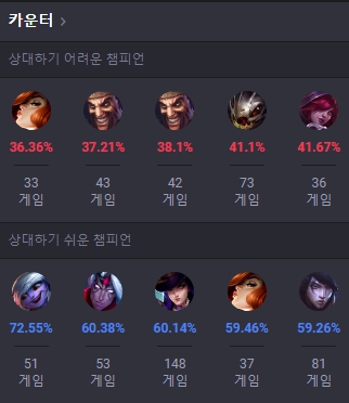 진의 카운터 챔피언은 미스 포츈, 드레이븐, 코그모, 자야로 집계되었으며, 상대하기 쉬운 챔피언은 트리스타나, 바루스, 케이틀린, 미스 포츈, 아펠리오스로 집계되었습니다.