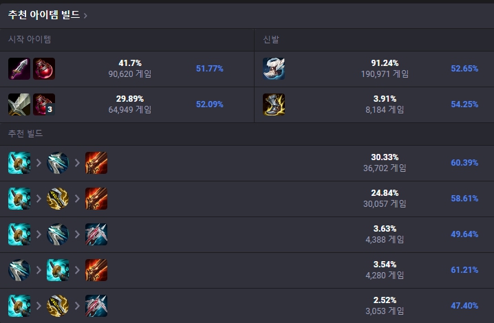 13.10 패치 이후 템트리가 변경되었는데, 처음 시작 아이템은 도란검으로 시작하여 첫 코어 아이템으로는 폭풍갈퀴를 올려줍니다. 폭풍갈퀴를 올린 뒤 신발은 신속의 장화를, 이후에는 신화 아이템인 돌풍이나 무한의 대검을 상황을 보고 올려주며 이후 고속 연사포까지 고정으로 띄워줍니다. 그 후에는 상황에 맞게 도미닉 경의 인사, 피바라기, 수호천사 등 유동적인 템트리를 올려줍니다.