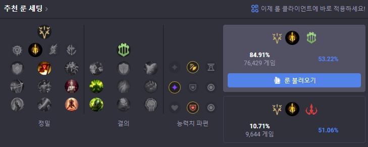 코그모 룬은 정밀에서 치명적 속도를 메인으로 사용하고 하위 룬으로는 승전보, 전설: 핏빛 길, 최후의 저항을 들어줍니다. 보조룬으로는 결의에서 사전 준비, 과잉 성장을 들어주고 능력치 파편으로는 공격 속도, 적응형 능력치, 방어력을 들어줍니다.