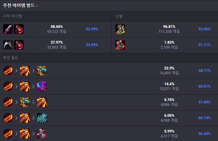 처음 시작 아이템은 도란의 검과 포션 하나로 시작하여 첫 코어 아이템으로는 구인수의 격노검을 올려줍니다. 구인수의 격노검을 올린 뒤 신발은 광전사의 군화를 올려주고, 루난의 허리케인까지 고정으로 띄워줍니다. 이후에는 보통 크라켄 학살자나 마법사의 최후를 띄워주고 마지막으로는 상황에 맞게 몰락한 왕의 검, 스태틱의 단검, 유령 무희 등 유동적인 템트리를 올려줍니다.