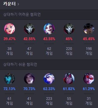 코그모의 카운터 챔피언은 세라핀, 진, 징크스, 닐라로 집계되었으며, 상대하기 쉬운 챔피언은 칼리스타, 카이사, 애쉬, 바루스, 베인으로 집계되었습니다.