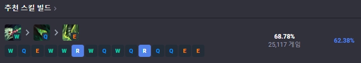 1레벨에는 W스킬, 2레벨에는 Q스킬, 3렙레에는 E스킬을 찍어주고 이후 4레벨부터는 R-W-Q-E 순서로 스킬을 마스터해주시면 됩니다.