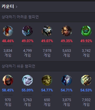 카직스의 카운터 챔피언은 피들스틱, 마오카이, 렝가, 니달리, 자크로 집계되었으며, 상대하기 쉬운 챔피언은 제드, 비에고, 아이번, 킨드레드, 마스터 이로 집계되었습니다.