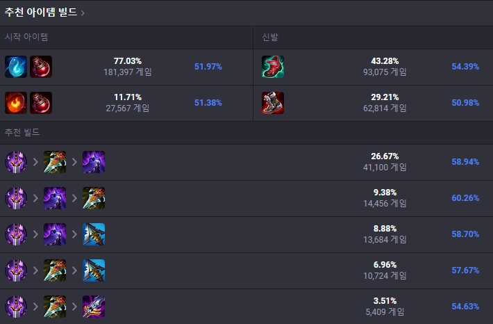 처음 시작 아이템은 새끼 바람둥이(파란템)와 포션 하나로 시작하여 첫 코어 아이템으로는 13.10 패치 이후 요우무의 유령검을 올려줍니다. 올린 뒤 신발은 명석함의 아이오니아 장화를 띄워주고 이후에는 자객의 발톱과 밤의 끝자락을 고정으로 상황을 보고 순서를 정해 띄워줍니다. 이후에는 세릴다의 원한, 멜모셔스의 아귀, 칠흑의 양날 도끼, 죽음의 무도 등 상황에 맞게 유동적인 템트리를 올려줍니다.