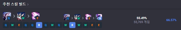 1레벨에는 Q스킬, 2레벨에는 W스킬, 3레벨에는 E스킬을 찍어준 뒤 4레벨부터는 R-Q-W-E 순서로 스킬을 마스터해주시면 됩니다. 궁극기를 찍을 때마다 스킬 진화는 기본적으로는 Q를 먼저 올리고 이후엔 교전이 잦으면 W나 E를 선택해 올려주고 마지막에는 R을 가는 경우가 보통입니다.