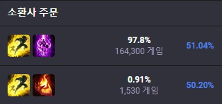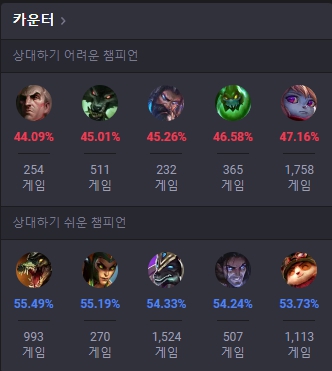 오른의 카운터 챔피언은 스웨인, 워윅, 우디르, 자크, 뽀삐로 집계되었으며, 상대하기 쉬운 챔피언은 레넥톤, 카시오페아, 나서스, 사일러스, 티모로 집계되었습니다.