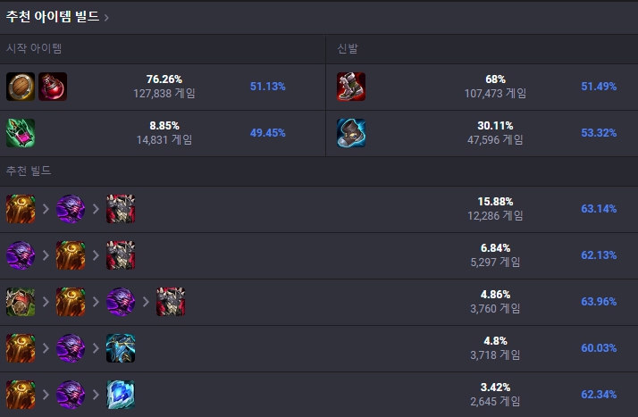 처음 시작 아이템은 도란의 방패와 포션 하나로 시작하여 첫 코어 아이템으로는 태양불꽃 방패를 올려줍니다. 태양불꽃 방패를 올린 뒤 신발은 상대에 따라 판금 장화나 헤르메스의 발걸음을 골라 올려주고 이후에는 해신 작쇼까지 고정으로 띄워줍니다. 이후에는 가시 갑옷, 대자연의 힘, 얼어붙은 심장 등 상황에 맞게 유동적인 템트리를 올려줍니다.