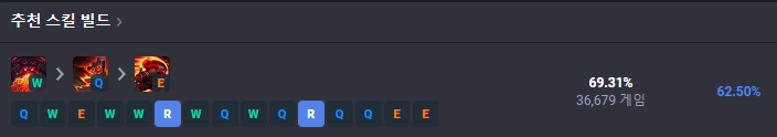 1레벨에는 Q스킬, 2레벨에는 W스킬, 3레벨에는 E스킬을 찍어준 뒤 4레벨부터는 R-W-Q-E 순서로 스킬을 마스터해주시면 됩니다.