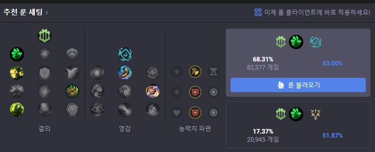 오른 룬은 결의에서 착취의 손아귀를 메인으로 사용하고 하위 룬으로는 철거, 뼈 방패, 과잉성장을 들어줍니다. 보조룬으로는 영감에서 마법의 신발, 비스킷 배달을 들어주고 능력치 파편으로는 공격 속도, 방어력, 방어력을 들어줍니다. 상대가 AP 챔피언인 경우엔 방어력 대신 마법 저항력과 체력을 들어주면 됩니다.