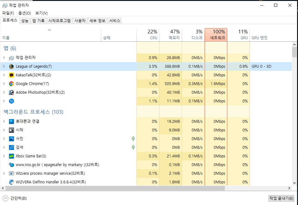 게임 시작이 눌러지지 않는 오류의 경우 작업 관리자를 열어준 뒤 앱에 있는 리그 오브 레전드 클라이언트를 클릭 후 작업 끝내기를 눌러주면 클라이언트가 재시작되면서 게임 이용이 가능해집니다.