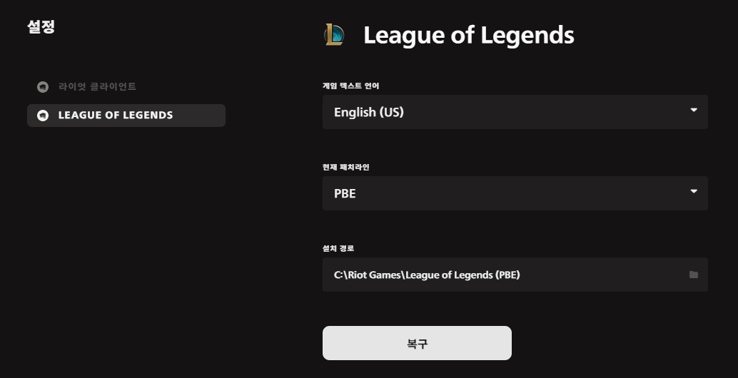 여하튼 롤토체스 PBE 서버 하려는 분들은 영어가 조금이라도 된다면 클라이언트에서 '설정'을 통해 언어를 영어로 바꿔준 후 플레이하면 되겠습니다.