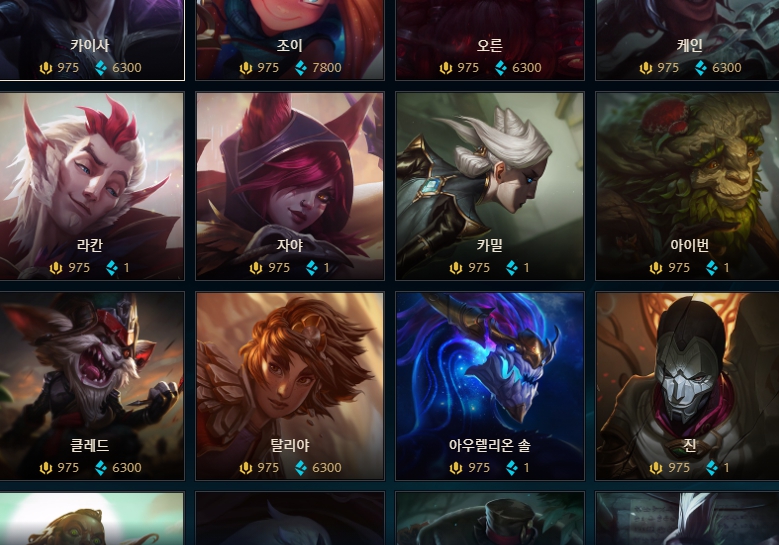 많은 챔피언들이 1 파랑 정수로 구매할 수 있었고, 아직 하진 않았지만 19시간마다 한 판 플레이할 시 3,000 RP가 지급된다고 합니다.