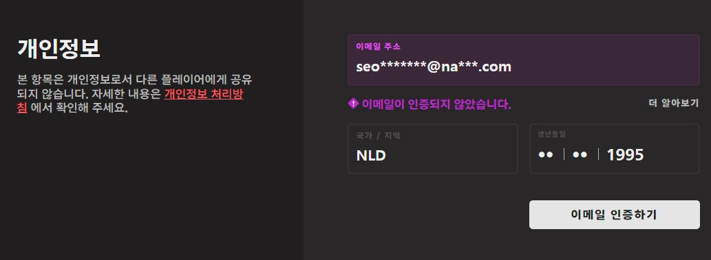 이렇게 국가 / 지역 부분에 N/A로 되어 있다면 로그인을 할 때 국적이 한국(KOR)로 바뀌어 거주지역 오류 및 연령 제한이 걸리기 때문에 국적이 바뀔 때 까지는 PBE 클라이언트에서 로그인을 하지 말아주어야 합니다. 10분 ~ 20분 정도 뒤 국가 / 지역이 바뀌었다면 로그인해주시면 됩니다.