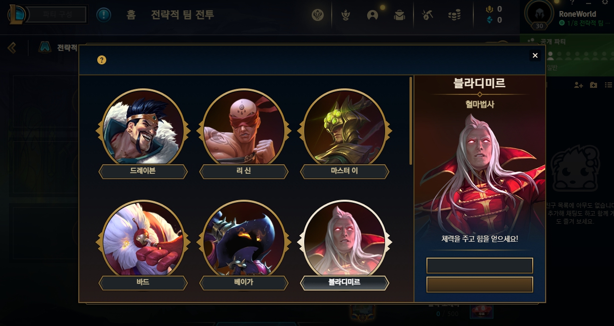 많은 챔피언들이 1 파랑 정수로 구매할 수 있었고, 아직 하진 않았지만 19시간마다 한 판 플레이할 시 3,000 RP가 지급된다고 합니다.