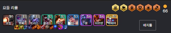 겹치지 않는 것이 가장 중요하며, 레벨업을 치지 않고 요들들을 모아줍니다. 5레벨일 때 뽀삐와 트리스타나 3성작이 거의 완료 되었다면, 이자를 받으며 6레벨에 가서 이후 클레드와 티모가 나올 확률을 높여주는게 좋습니다. 또한 요들 시너지의 경우 요들 3성이 3명 이상인 경우가 아니라 그냥 아무 아군 유닛이 3성이 3개 이상이 되어도 요들 3성이 4성이 됩니다. 즉 요들(3)이 활성화된 상태에서 뽀삐 3성과 다른 특성의 유닛 3성이 두 명인 경우 뽀삐가 4성이 된다는 것이죠. 하이머딩거를 제외한 요들 3성작이 완료된 이후에는 50원 이자를 받으며 레벨업을 쳐주면서 소나, 쉔, 자르반을 찾아 넣어주고, 마지막으로 8레벨을 찍고 하이머딩거를 넣어주면 됩니다.