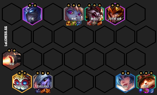 요들 리롤덱은 뽀삐, 트리스타나, 클레드, 티모, 소나, 쉔, 자르반, 하이머딩거로 이루어져 있습니다. 핵심 딜러는 트리스타나, 클레드, 티모 중 두 명을 골라 선택해주면 되고, 탱커로는 뽀삐를 사용합니다.