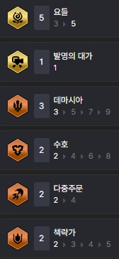 덱을 완성시키면 챙길 수 있는 시너지는 요들(5), 발명의 대가(1), 데마시아(3), 수호(2), 다중주문(2), 책략가(2)입니다. 뒤집개가 나온다면 두 개를 모아 왕관을 만들어주거나 아니면 클레드에게 템을 몰아주고 학살자 상징(뒤집개 + 장갑)을 만들어 티모나 트리스타나에게 주는 것 혹은 사용하지 않는 것을 추천드립니다.