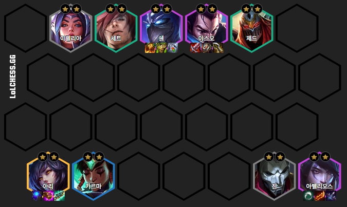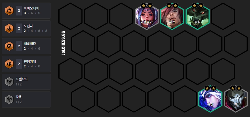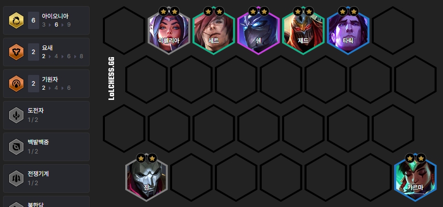 5레벨에는 이렐리아, 진, 세트, 애쉬, 워윅을 사용해 아이오니아(3), 도전자(2), 백발백중(2), 전쟁기계(2)를 받으며 빌드업해줍니다. 진에게 아펠리오스 아이템을 몰아주고, 워윅에게 쉔에게 줄 아이템을 몰아주면서 진행합니다.