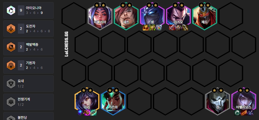 5레벨에는 이렐리아, 진, 세트, 애쉬, 워윅을 사용해 아이오니아(3), 도전자(2), 백발백중(2), 전쟁기계(2)를 받으며 빌드업해줍니다. 진에게 아펠리오스 아이템을 몰아주고, 워윅에게 쉔에게 줄 아이템을 몰아주면서 진행합니다.