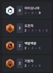 덱을 완성시키면 챙길 수 있는 시너지는 아이오니아(9), 도전자(2), 백발백중(2), 기원자(2)입니다.