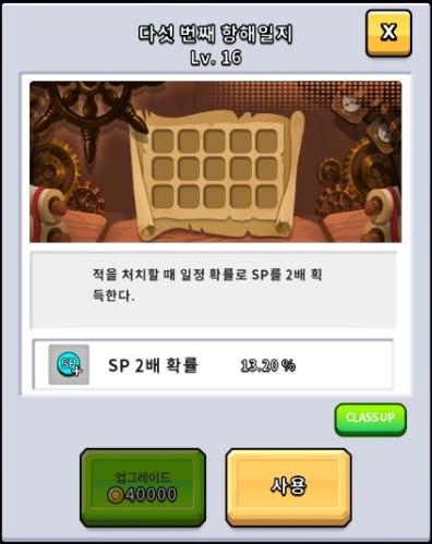 또한 필드마다 효과가 제각각인데요, 대체적으로 현재 가장 인기 있는 필드는 다섯 번째 항해일지 필드로 적을 처치할 때 일정 확률로 SP를 2배 획득하는 필드입니다. 필드 레벨 만렙 기준으로 15% 확률로 2배의 SP가 들어오게 되며 콤보 주사위를 이용한 협동전 덱에 자주 사용되고 있습니다.