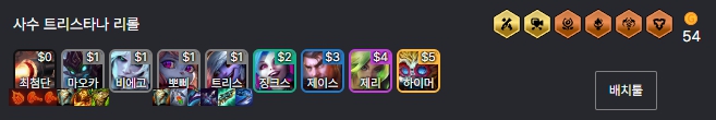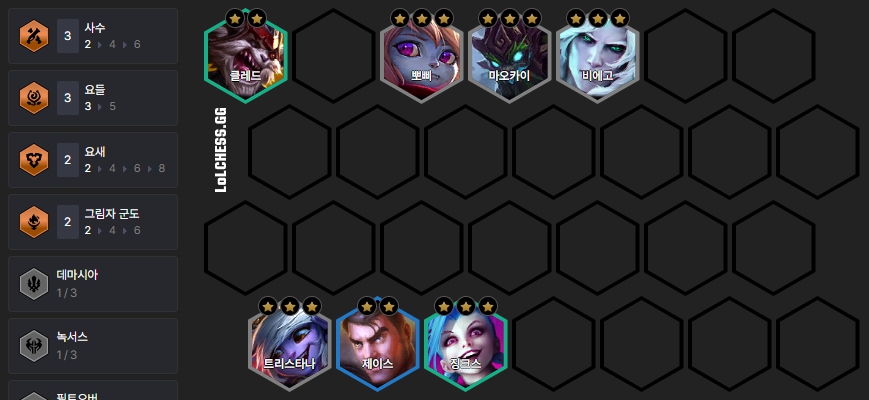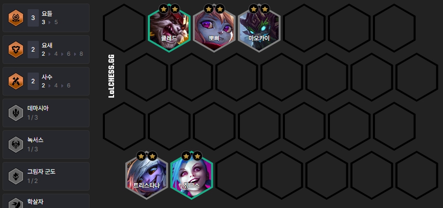 기본적으로 트리스타나를 포함한 3성이 3개 찍히기 전 까지는 레벨업을 치지 않습니다. 초반 5레벨에는 트리스타나에게 템이 잘 나온 경우 위와 같이 뽀삐, 마오카이, 트리스타나, 클레드, 징크스로 빌드업하고, 만약 마오카이에게 템이 잘 나온 경우엔 클레드 대신 비에고를 넣어 빌드업합니다.