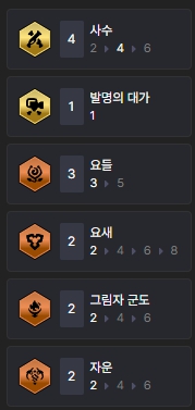 덱을 완성시키면 챙길 수 있는 특성은 사수(4), 발명의 대가(1), 요들(3), 요새(2), 그림자 군도(2), 자운(2)입니다.