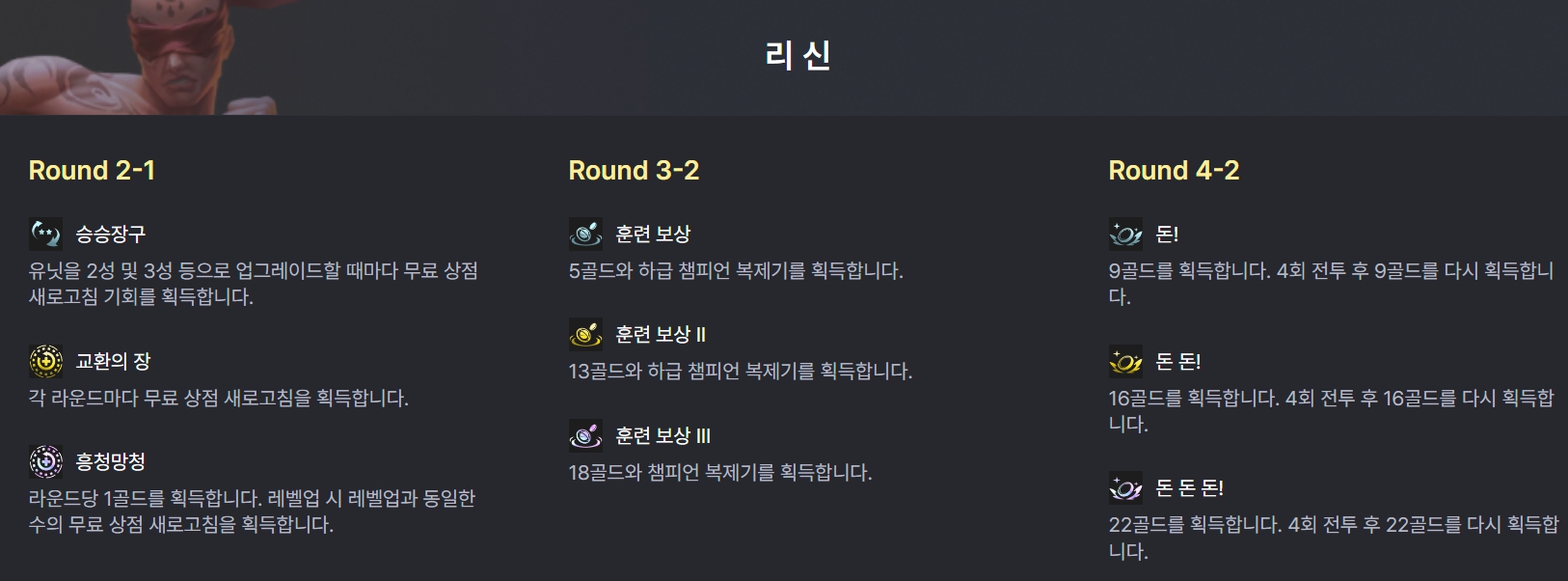 리신 전설을 고르고 첫 증강체가 실버 증강체인 승승장구 일 때가 가장 좋으며, 골드 증강체인 교환의 장을 골라도 무난합니다. 그 외에는 활의 수호자, 검의 수호자, 적을 알라, 결투하는 사수와 같은 전투형 증강체나 리롤 관련 증강체, 사수 관련 증강체가 좋습니다.