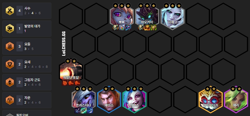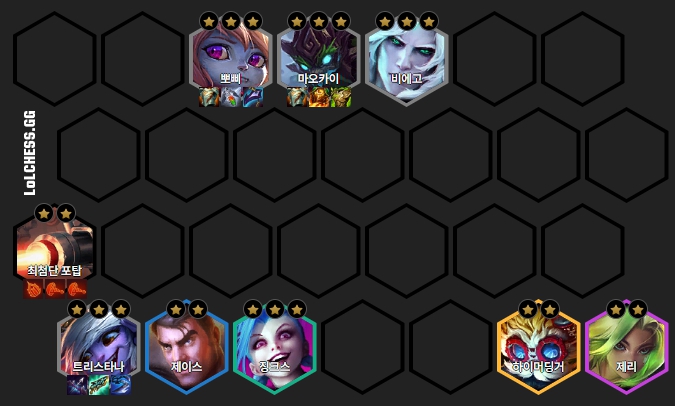 사수 트리스타나 리롤덱의 최종 구성은 마오카이, 비에고, 뽀삐, 트리스타나, 징크스, 제이스, 제리, 하이머딩거로 이루어져 있습니다. 보통 최종 덱까지 맞춰지는 경우는 흔하지는 않습니다.