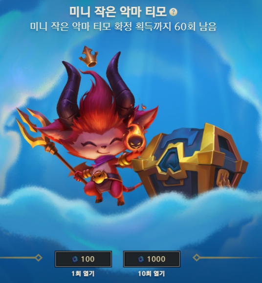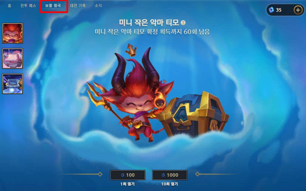 보물 토큰으로는 '미니 작은 악마 티모', '최초의 땅 성소', '메카 프라임 제로'를 뽑을 수 있는 뽑기를 할 수 있습니다. 60회를 돌리면 확정으로 나오고, 60회까지 가지 않더라도 굉장히 낮은 확률로 뽑을 수 있습니다.