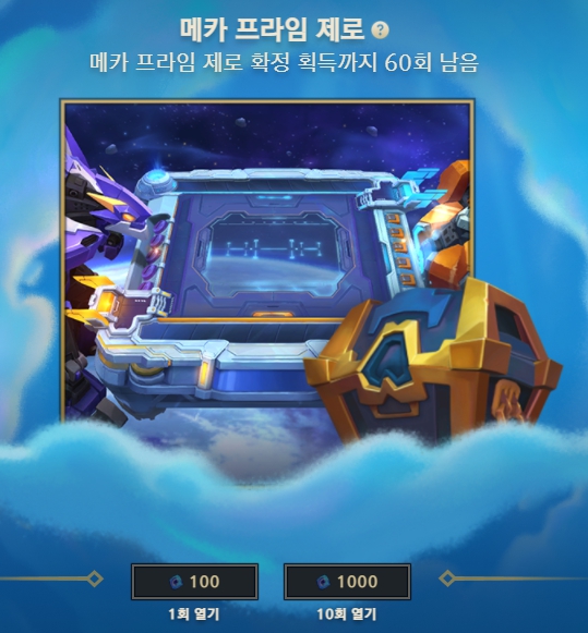 보물 토큰으로는 '미니 작은 악마 티모', '최초의 땅 성소', '메카 프라임 제로'를 뽑을 수 있는 뽑기를 할 수 있습니다. 60회를 돌리면 확정으로 나오고, 60회까지 가지 않더라도 굉장히 낮은 확률로 뽑을 수 있습니다.