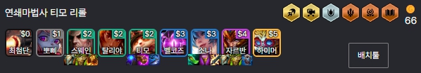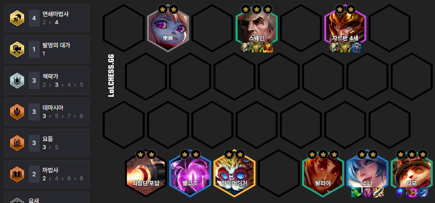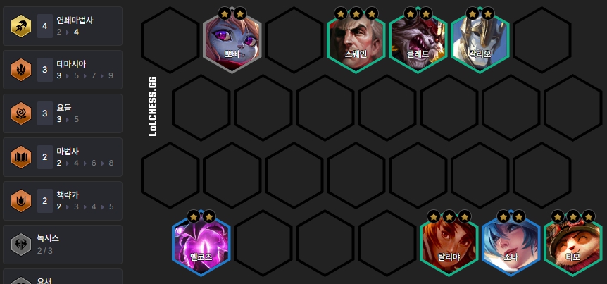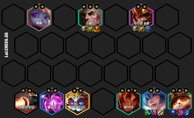 보통 6레벨부터 50원 이자를 받으며 리롤을 쳐서 티모를 포함한 유닛 3명을 3성작해주며, 이후 7레벨을 올려서 뽀삐, 스웨인, 클레드, 갈리오, 티모, 탈리야, 소나, 벨코즈로 빌드업해주면 됩니다.