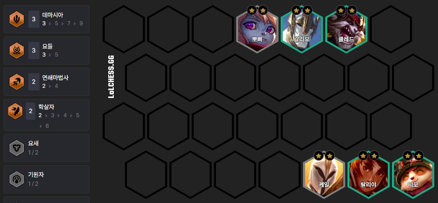 5렙 기준 뽀삐, 케일, 갈리오, 클레드, 탈리야로 데마시아(3), 요들(3), 연쇄마법사(2), 학살자(2)로 빌드업해주는게 좋습니다.