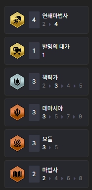 덱을 완성시켰을 때 챙길 수 있는 특성은 연쇄마법사(4), 발명의 대가(1), 책략가(3), 데마시아(3), 요들(3), 마법사(2)입니다.